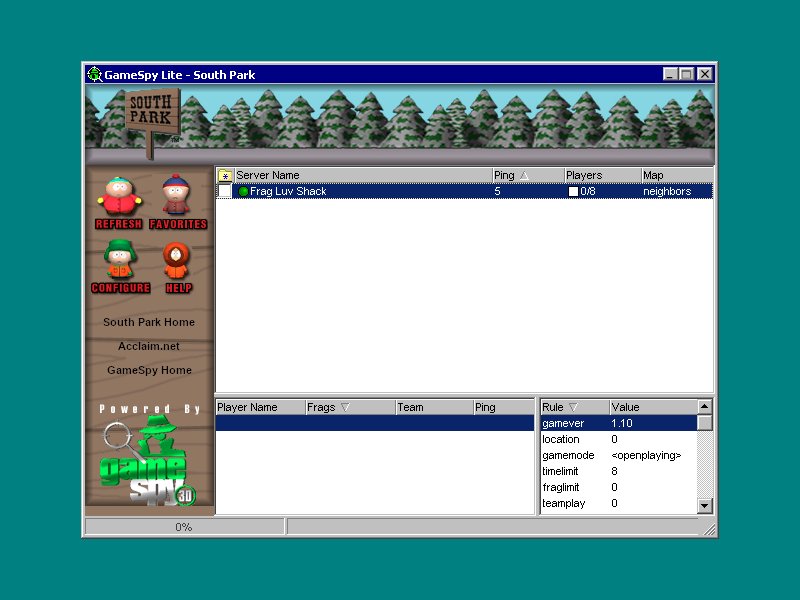 • Numerous multiplayer options. South Park will ship with GameSpy support out of the box, so gamers can easily create and join multiplayer games via the Internet or their local area network.